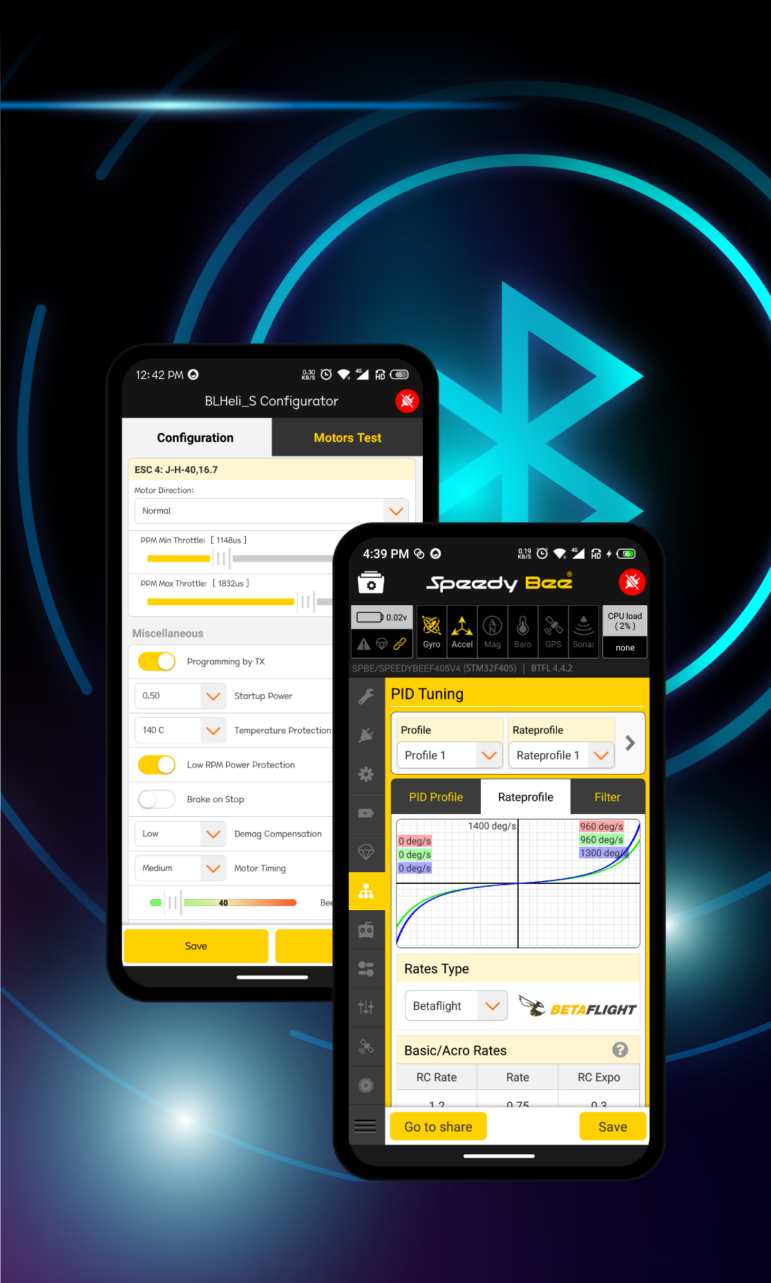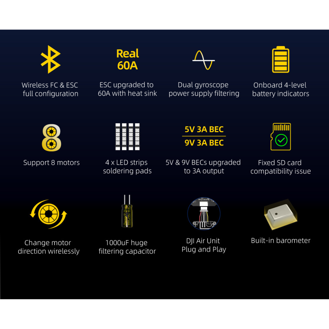 | BLE Bluetooth | Supported. Used for Flight Controller configuration (MSP should be enabled with Baud rate 115200 on UART4) |