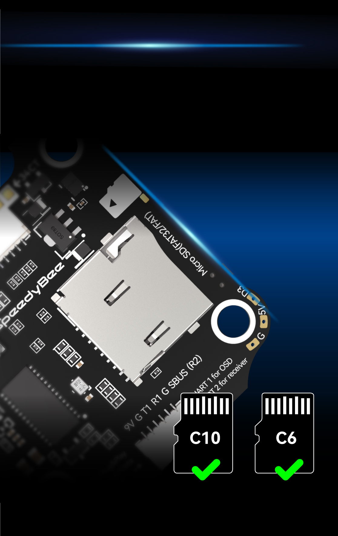 | Blackbox MicroSD Card Slot | *Betaflight firmware requires the type of the microSD card to be either Standard (SDSC) or High capacity (SDHC) under 32GB, so extended capacity cards (SDXC) are not supported (Many high-speed U3 cards are SDXC). Also the microSD card MUST be formatted with the FAT16 or FAT32 (recommended) format. So, you could use any SD card less than 32GB, but the Betaflight can only recognize 4GB maximum. We suggest you use this 3rd party formatting tool and choose ‘Overwrite format’ then format your card. Also check out here for the recommended SD cards or buy the tested cards from our store. |